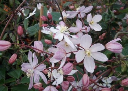 Ce que l’on remarque tout de suite chez cette clématite armandii, ce sont ses nombreux boutons roses qui donnent des fleurs blanches et rosées délicatement parfumées.