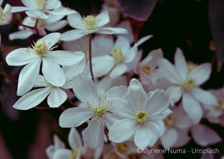 La clématite armandii ou clématite du Père Armand, est un classique parmi les clématites à floraison hivernale et printanière. Originaire de Chine, c’est une plante grimpante très vigoureuse pouvant atteindre 5 à 10 m de hauteur. Les boutons floraux apparaissent dès janvier et évoluent en fleurs d’un blanc pur qui éclosent entre février et fin avril selon les régions. Ses fleurs blanches d’environ 5 cm de diamètre sont portées par de de fins pétioles pourpres qui servent de vrilles pour s’accrocher au support. Elles exhalent un léger parfum combinant la fleur d’oranger et la vanille. L’autre atout de cette clématite, c’est son feuillage persistant. Ses jeunes feuilles sont rouge pourpré puis deviennent vert foncé.