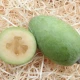 FEIJOALe Feijoa est un arbuste érigé et rustique au feuillage persistant qui produit en été des fleurs blanches très originales avec leur coeur d’étamines rouges. Les pétales sont comestibles. Suivent en fin d’automne des fruits verts allongés, assez gros (4 à 8 cm), juteux, très appréciés pour leur goût, mélange de fraise, goyave et ananas. La variété de Goyavier du Brésil Coolidge est autofertile.