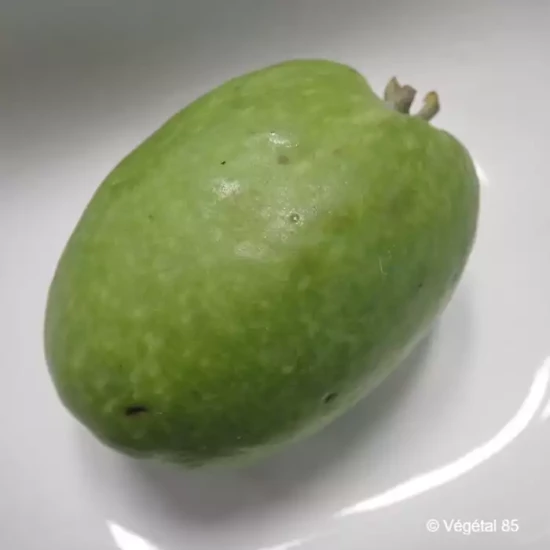 Le Feijoa Mammouth est un arbuste vigoureux, érigé au joli feuillage persistant vert au revers argenté. Il produit en été des fleurs blanches au coeur d’étamines rouges très décoratives. Les pétales sont comestibles au léger goût de banane. Suivent en fin d’automne des fruits verts, ovales à ronds, juteux, à la peau lisse, assez gros, très appréciés pour leur goût exotique qui mélange la fraise, la goyave et l’ananas. Cet arbuste résiste au froid jusqu’à -10/-12°C. Partiellement autofertile, il est préférable de planter au moins deux goyaviers du Brésil de variétés différentes pour une bonne pollinisation. La variété Triumph est recommandée.