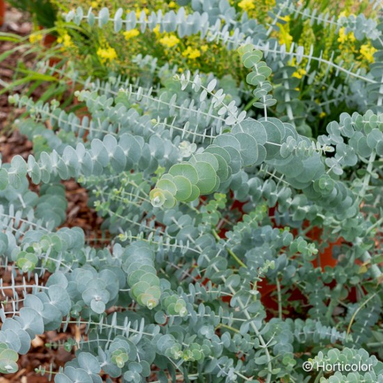 Arbre au feuillage bleuté très décoratif et parfumé. Jeunes feuilles bleu gris rondes accolées deux par deux. Feuilles adultes allongées gris-vert bleuté.