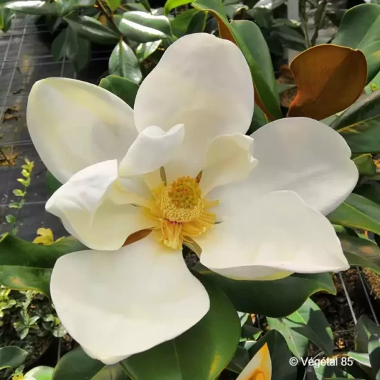 Arbre de grand développement persistant, grandes feuilles vernissées, fleur odorantes blanc-crème de 25 cm en été.