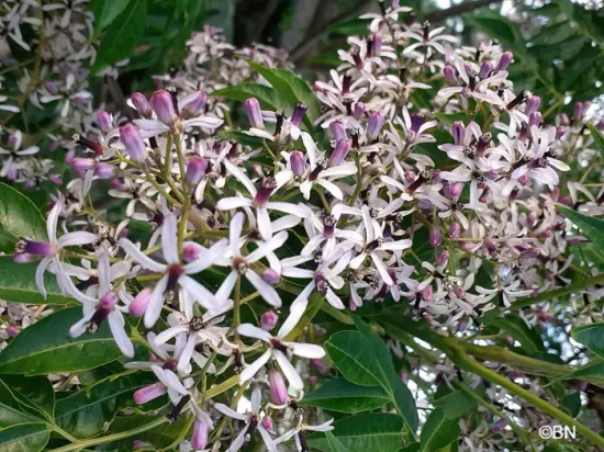Petit arbre de climat doux élégant. Port étalé et ramifié. Petites fleurs en étoile rose lilas avec un tube d'étamines réunies en panicules, parfumées. Fruits ovoïdes jaunes. Peut être planté en pot et hiverné en véranda. Croissance rapide.