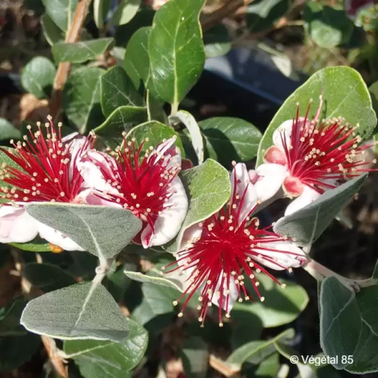 FEIJOALe Feijoa est un arbuste buissonnant, rustique et persistant qui offre une floraison originale et des fruits au goût exotique. Cette variété est beaucoup plus forifère et possède un port très compact. Entre octobre et décembre, vous récolterez les fruits du goyavier du Brésil, verts, ovales à la saveur rappelant la fraise, la goyave et l’ananas.