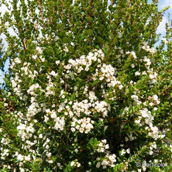 Myrte du ChiliCe bel arbuste buissonnant est apprécié pour sa généreuse et originale floraison blanche et parfumée et pour son feuillage persistant et aromatique. Suivent, après un été long et chaud, des baies noires comestibles et appréciées des oiseaux. Cette myrte du Chili est idéale en haie ou en isolé. Hauteur : 4 à 5 m. Rustique -5°C. Écorce décorative orangé.
