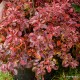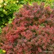 Arbuste globuleux, caduc, épineux, au feuillage décoratif dense et lumineux. D'abord rouge vif puis rouge foncé finement marginé de jaune, il se teinte d'un beau rouge orangé à l'automne. Petites fleurs en clochettes, jaunes tachetées de rouge en mai. Fruits rouges décoratifs en automne. Bel arbuste facile à vivre à planter en bordure, massif, bac ou rocaille. Rustique jusqu’à -15°C.