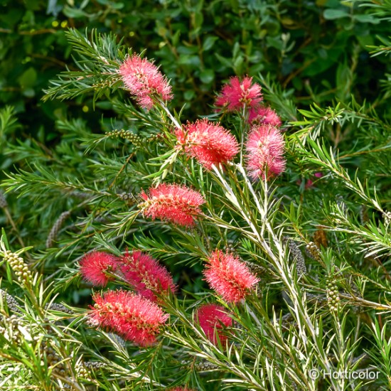 "Arbuste à rameaux raides et feuilles pointues. Nombreux épis de fleurs rouge profond, ressemblant à des rince-bouteilles. Les callistemons sont plus beaux si ils sont arrosés régulièrement en été. "