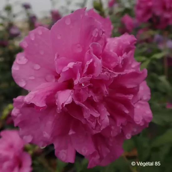 Cet arbuste aux rameaux érigés s'ornera, d'août à octobre, de grandes fleurs doubles violettes en chiffon. C'est une plante rustique et florifère qui apportera une touche tropicale au jardin ou sur la terrasse. Feuillage doré à l'automne.