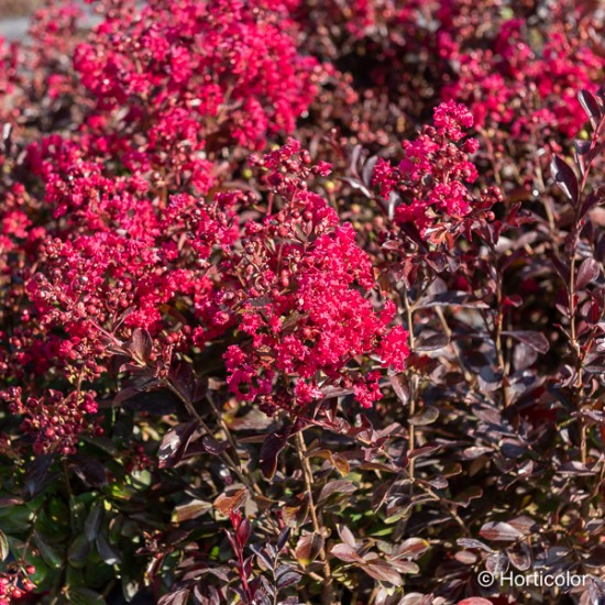 LILAS DES INDESPetit arbre caduc magnifique en toutes saisons : floraison estivale en thyrses rouge pourpre, coloration rouge orangé automnale, écorce grise et marron se détachant du tronc. Résiste à la pollution. Port compact idéal pour les petits espaces.