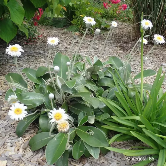 "Vivace buissonnante d'1 m de haut, au feuillage duveteux gris argenté. Elle fleurit en juillet août en produisant de grandes marguerites de 5 cm de diamètre. Bonne plante de bord de mer."