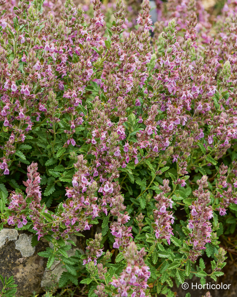 Germendrée petit chêne"Plante facile à vivre, basse, couvrante, elle fleurit violet mauve de juin à septembre. Petites feuilles persistantes vert foncé à bords crénelés. Rustique jusqu'à -20°C."