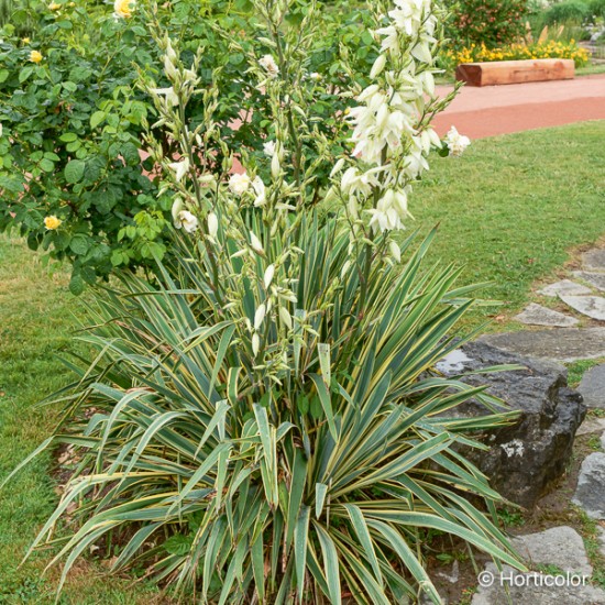 Un yucca rustique (-15°C) pour une ambiance exotique ! Floraison estivale blanc-crème spectaculaire et parfumée. Variété au feuillage souple, panaché vert bordé de jaune et faisant une foule de filaments décoratifs en bordure. Plantez en plein soleil, en sol bien drainé. Résistant à la sécheresse et aux embruns.