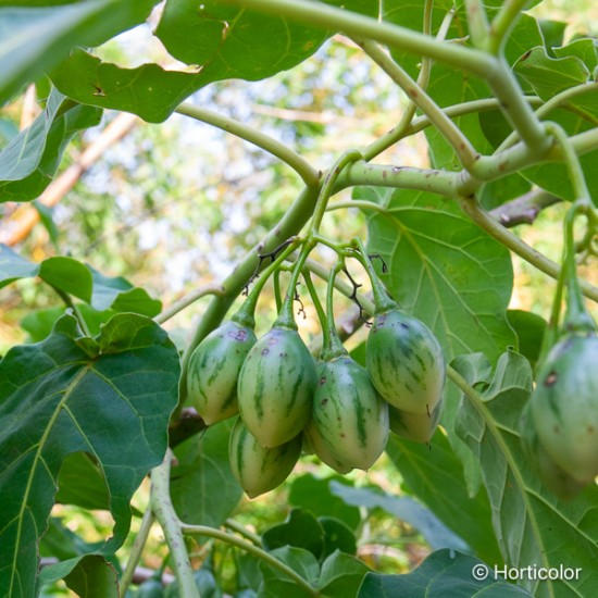 Arbuste ou petit arbre persistant à croissance rapide pouvant atteindre 3 m de haut. Il produit des fruits comestibles rouges en forme d’oeuf. Ils se récoltent en été et en automne. Les fruits de ce Tamarillo se consomment aussi bien crus, à la manière d’un kiwi ou en salade, que cuits. Ils ont un goût sucré et acidulé rappelant un peu le kiwi ou la groseille à maquereaux. Rustique jusqu’à -3°C.
