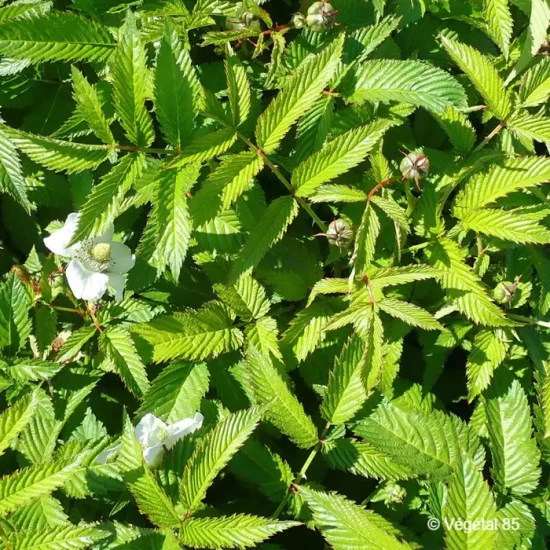 "Proche parent du framboisier qui produit des fruits comestibles ressemblant à des fraises. Hteur : 30 cm, s'étale sur environ 1 m"