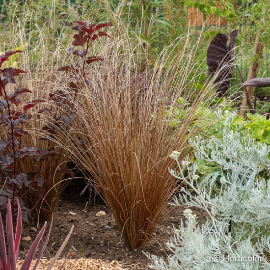 Graminée de taille moyenne, formant une touffe évasée au feuillage cuivré. Très facile et décorative toute l'année. Pour vos massifs de terrain frais et potées.