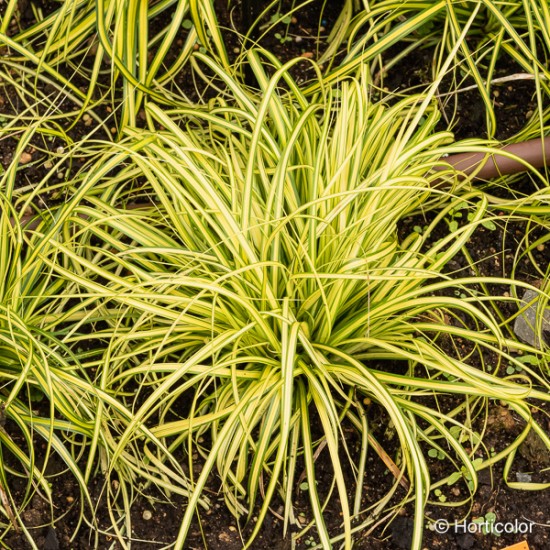 Graminée en touffe au feuillage, fin et souple, persistant, jaune clair bordé de vert. Petit développement (40 x 40 cm). En massif ou en pot.