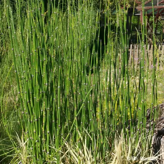 Prêle pouvant atteindre 1,80 m de haut, aux tiges parfaitement droites, vert foncé, entrecoupées d'anneaux noirs. Prend des teintes cuivrées en hiver. Rustique jusqu’à -15°C.