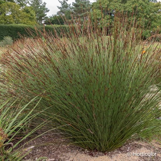 Cette vivace, qui ressemble fortement à des joncs, forme une touffe dense et érigée de 1,20 m de haut. Chaumes vert foncé sans feuilles. Fleurs marron foncé à l’extrémité des chaumes. Résiste à la sécheresse estivale et aux embruns. Idéal dans les jardins de bord de mer.