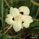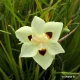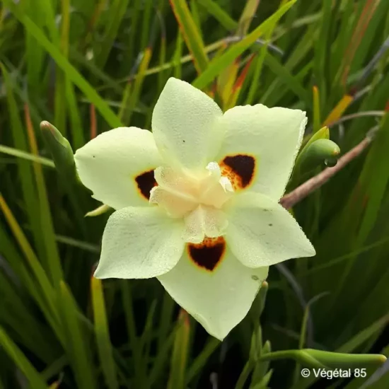 Iris à feuillage persistant aux jolies fleurs blanches maculées de brun à la base.