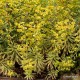 Vivace persistante décorative toute l'année de petit développement (60 cm en tous sens). Très belles feuilles vertes marginées de jaune crème, jeunes feuilles rouges. Floraison jaune vert à oeil rouge d'avril à juin. Rustique -15°C. A planter dans un sol drainant. Supporte la sécheresse. Latex toxique.