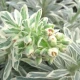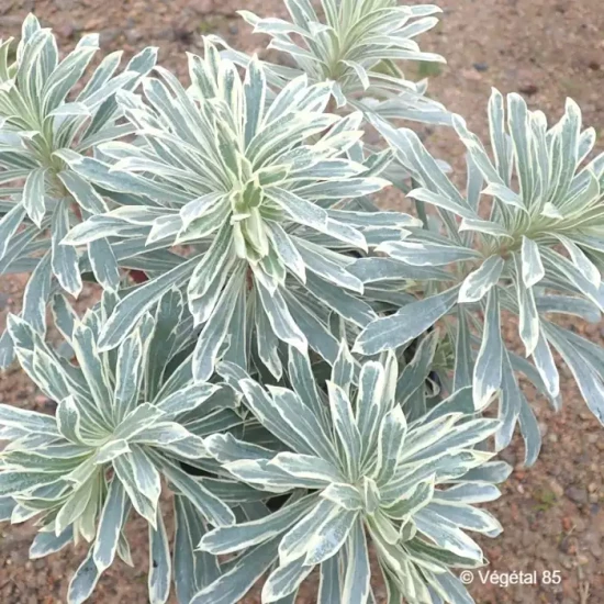Vivace persistante décorative toute l'année, à moyen développement (hauteur 50/70 cm). Feuillage panaché vert gris, bordé de blanc. Floraison discrète crème de mars à mai. Rustique -15°C. A planter dans un sol drainant. Latex toxique.