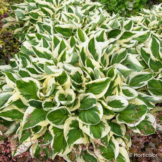 "Plante vivace de mi-ombre, cet hosta à petit développement possède un magnifique feuillage ovale légèrement gaufré, lustré, vert foncé à large marges blanches. Floraison blanche à nervure lavande en juin-juillet. Résistant aux limaces. Tolérant une exposition ensoleillée."