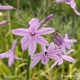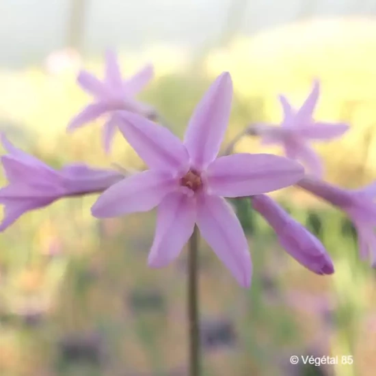 Petite touffe dressée de fines feuilles souples, rubanées et aromatiques. Oui, cette plante vivace sent l'ail ! Très longue floraison, en ombelles de petites fleurs lilas et parfumées se dégageant bien au-dessus du feuillage. Plantez votre tulbaghia idéalement au soleil en sol drainant. Rustique -5°C. Convient en pot.